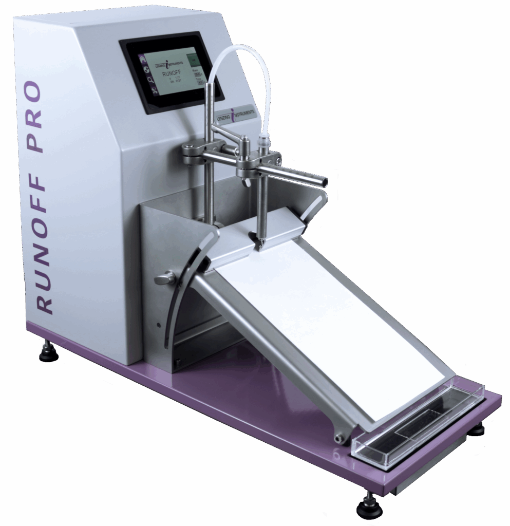 With RUNOFF, test parameters such as slope angle, dosing volume and liquid discharge time can be individually adjusted. The Test principle of RUNOFF enables the runoff test to be performed either as a basic test or as a repeated test, according to the specifications of INDA/EDANA.